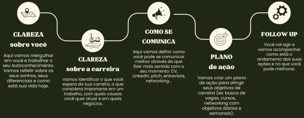 💡 Na mentoria, vamos desenhar onde você quer chegar, as possibilidades que existem e o plano pra você atingir seus objetivos de carreira. Iremos falar também sobre como contar a sua história e criar relacionamentos para potencializar a sua carreira.